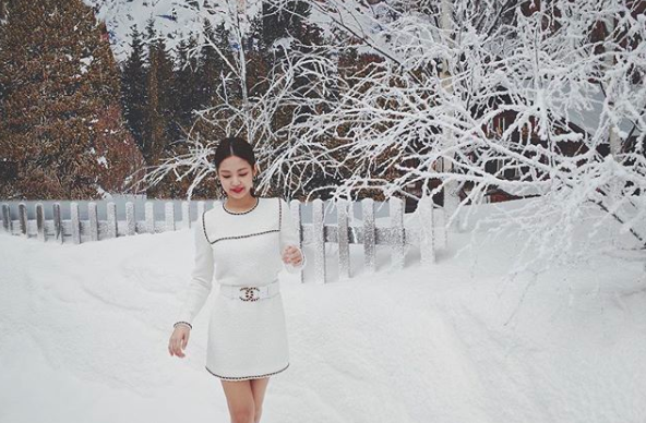 제니는 새하얀 설원으로 꾸며진 쇼장에서 화이트 원피스를 입고 있다. 특히 제니의 패셔너블한 매력과 인형 같은 외모가 어우러져 시선을 사로잡는다.