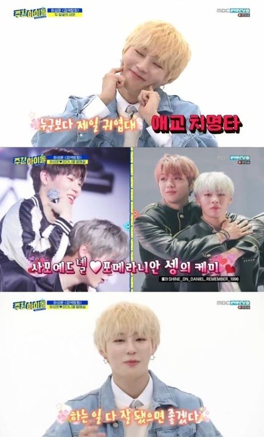 6일 방송된 MBC 에브리원 ‘주간 아이돌’에 최근 솔로곡 ‘버드’로 데뷔에 성공한 하성운이 단독 게스트로 나왔다. 워너원 멤버가 아닌 솔로 가수로 처음 출연한 그는 “어린왕자 콘셉트”라며 금발머리를 한 채 수줍게 웃었다.