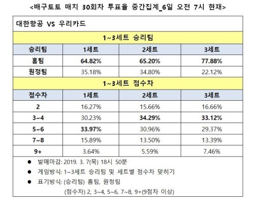 1~3세트 승리팀과 점수차를 맞히는 배구토토 매치 30회차 게임에서 1~3 세트별 예상 승리팀은 모두 홈팀인 대한항공의 차지로 돌아갔다.