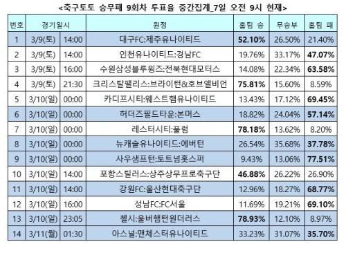 EPL 및 K리그 14경기 대상 축구토토 승무패 9회차 투표율 중간집계 결과