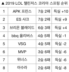 bbq는 8일 오후 서울 대치동 프릭업스튜디오에서 열린 '2019 LOL 챌린저스 코리아(이하 롤 챌린저스)' 스프링 스플릿 브리온과 2라운드 경기서 2-0으로 승리했다. bbq는 시즌 4승 5패 득실 -1를 올리면서 한계단 상승한 4위를 기록했다. 이번 패배에도 3위(6승 3패 득실 +4)를 유지한 브리온은 중위권 팀들에 추격을 허용하게 됐다.
