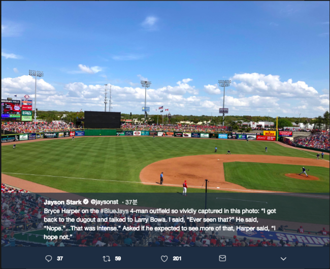 한편, 이날 하퍼를 상대한 토론토 벤치는 그동안 보지 못했던 수비 시프트를 선보이며 하퍼를 비롯한 모두를 놀라게 했다. 이날 토론토 수비진은 하퍼의 두 타석 모두 내야수를 3명만 놓은 채 외야에만 4명의 선수를 놓는 수비 시프트를 펼쳤다. 내야의 3루 쪽이 모두 비어 있었다. 좌측과 우측으로 움직이는 수비 시프트는 이미 통용되고 있는 현실에서, 외야와 내야 숫자가 바뀌는 수비 시프트를 실전 경기에서 선보이는 것은 보기 힘들었다.