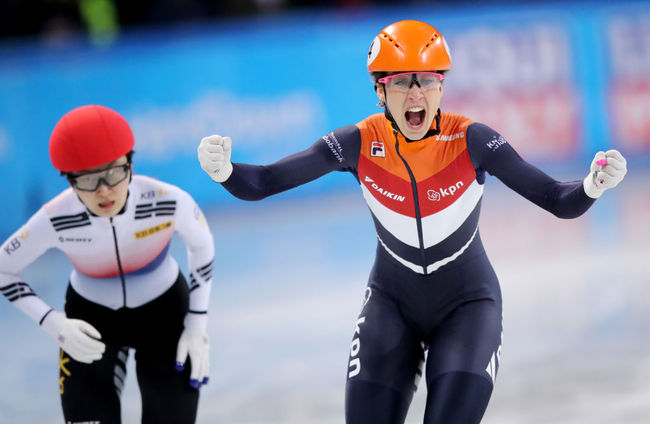 [사진] 임효준이 슈퍼파이널서 1위로 골인하는 순간(위), 최민정이 슈퍼파이널서 수자 슐팅에 아쉽게 1위를 내주는 모습 / ISU 홈페이지