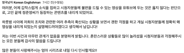 이어 "하룻밤 사이에 저희의 조치와 관련한 여러 추측이 확산되는 상황을 보면서 괜한 걱정을 하고 계실 시청자분들께 정확히 왜 영상을 내리게 되었는지 설명해드려야겠다고 생각해서 남긴다"며 "저는 이번 사건과 아무런 관계가 없음을 분명하게 밝힌다"고 해명했다.