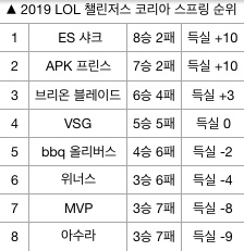 ESS는 14일 오후 서울 대치동 프릭업스튜디오에서 열린 '2019 LOL 챌린저스 코리아(이하 롤 챌린저스)' 스프링 스플릿 bbq와 2라운드 경기서 2-1로 승리했다. ESS는 시즌 8승 2패 득실 +10을 올리면서 APK를 제치고 1위로 올라섰다. 이번 패배로 bbq는 4승 6패 득실 -2를 기록, 아슬아슬하게 5위에 걸터앉았다.