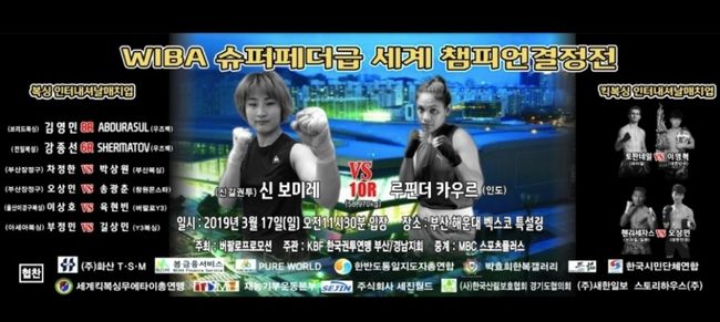 버팔로프로모션은 이달 17일 부산 해운대 벡스코 특설링서 신보미레(신길권투)와 루핀더 카우르(인도)가 WIBA(세계여자복싱협회) 슈퍼페더급(58.97㎏) 타이틀매치를 벌인다고 15일 밝혔다.