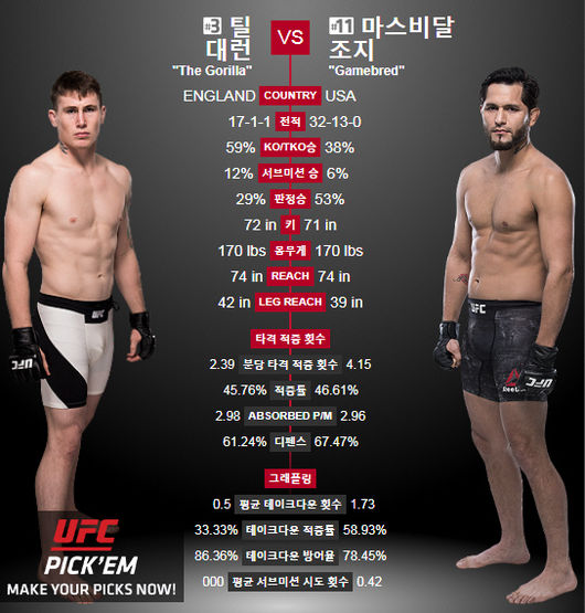 마스비달은 1년 4개월 간 공백기를 가졌다. 최근 두 경기에서 연달아 판정패하며 침체에 빠졌던 마스비달이 오랜만에 돌아온 UFC에서 연패의 고리를 끊어낼 수 있을지 관심이 모인다. 3위 틸을 잡으면 TOP 5로 단숨에 도약할 수 있기 때문에 간절한 1승이다. / 10bird@osen.co.kr