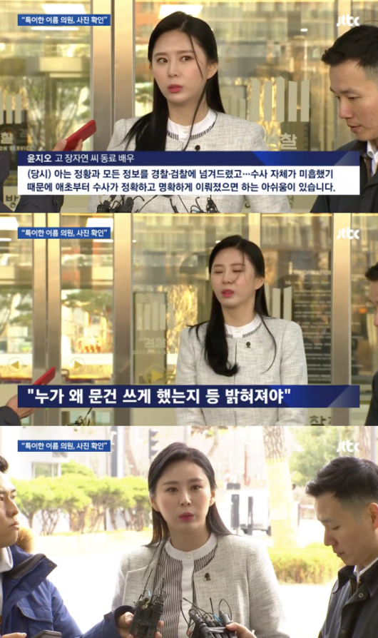 사건의 유일한 목격자로 알려진 배우 윤지오는 지난 5일 장자연의 사망 10주기를 맞아 tbs 교통방송 라디오 '김어준의 뉴스공장'에서 실명과 얼굴을 공개했고, 이후 참고인 신분으로 대검찰청 검찰과거사 진상조사단에 출석했다. 이후 서울 광화문 세종문화회관앞에서 여성단체와 첫 기자회견을 열었다.