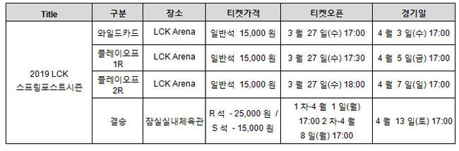 대망의 결승전은 4월 13일 오후 5시 잠실실내체육관에서 열리며, 정규 리그 1위팀과 플레이오프 최종승자가 LCK 스프링 우승 타이틀을 놓고 대결하게 된다. 2019 LCK 스프링 우승팀에게는 우승 상금 1억원(총상금 2억 9500만원)과 함께 LCK 대표로 5월 1일부터 19일까지(현지 시각 기준) 베트남과 대만에서 개최되는 ‘미드 시즌 인비테이셔널(MSI)’에 출전할 자격이 주어진다.