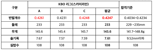 이번 검사는 KBO리그 단일 경기 사용구인 스카이라인 AAK-100의 샘플 3타를 무작위로 수거한 뒤 지난 11일부터 14일까지 국민체육진흥공단(KSPO) 스포츠용품시험소에 의뢰해 진행됐다.