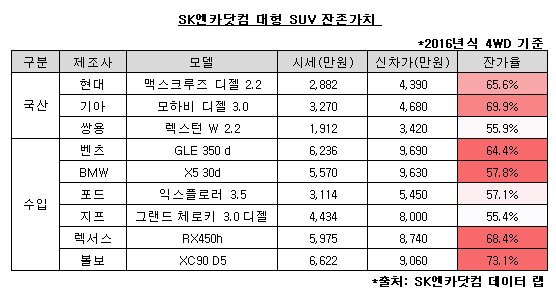 '국산은 기아차 모하비, 수입은 볼보 XC90'. 중고차 유통 플랫폼 SK엔카닷컴이 대형 SUV의 중고차 잔존가치를 분석했더니 두 차종의 잔존가치가 상대적으로 높은 것으로 나타났다. 2016년식 차량의 경우 XC90은 잔가율이 73.1%나 돼 전체에서도 수위를 달렸다.