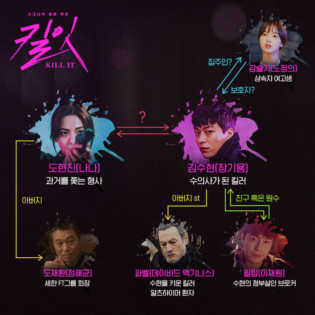 ‘킬잇(Kill it)’ 장기용과 나나를 둘러싼 인물 관계도가 공개됐다. 두 사람 사이에 그려진 물음표가 어떻게 변화할지 호기심을 자극한다.