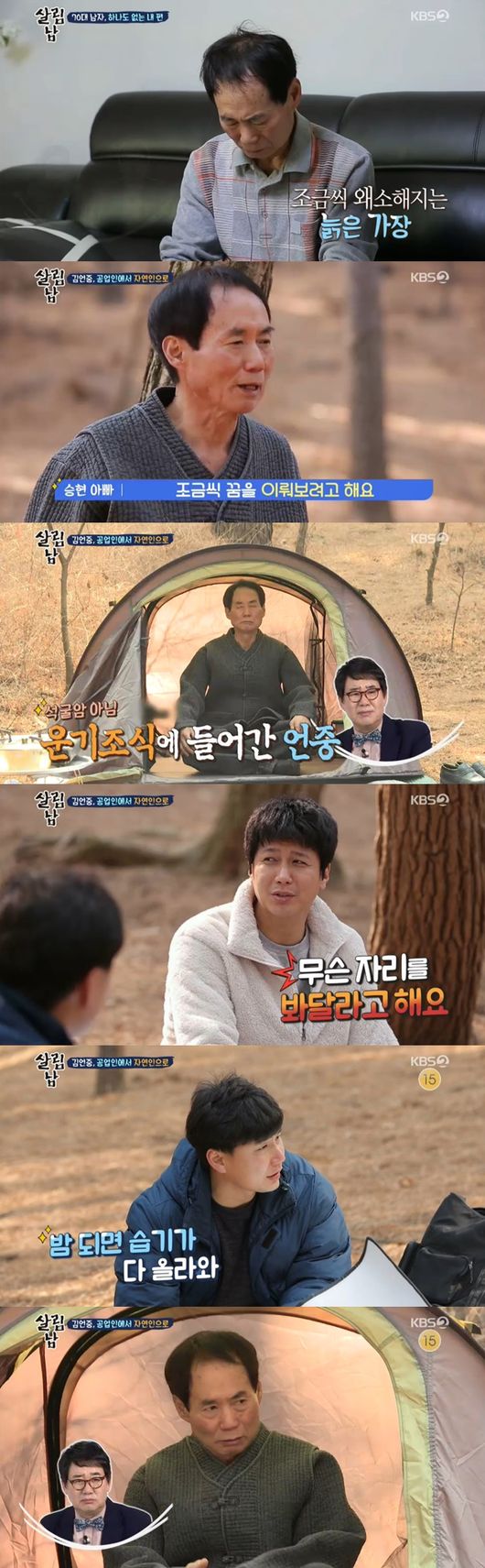 그러면서 갑자기 자연인이 되겠다며 캠핑에 나섰다. 김승현父는 "자연인으로 산에서 사는 것이 내 꿈이었다"면서 "공기 좋은 곳에서 사는 것, 자연인들 보며 부러워했다"며 온갖 자유를 만끽했다.