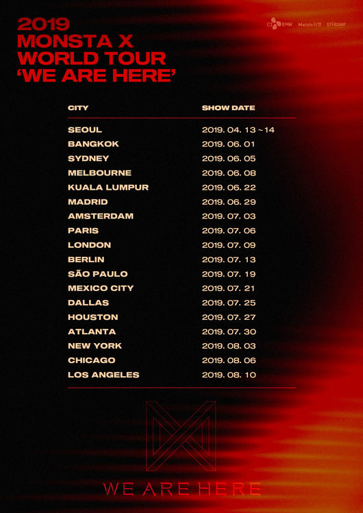 몬스타엑스는 오는 4월 13일과 14일 양일간 서울 올림픽공원 SK올림픽 핸드볼경기장에서 2019 월드투어의 첫 시작인 '2019 MONSTA X WORLD TOUR 'WE ARE HERE' IN SEOUL'를 시작으로 아시아, 유럽, 북미, 남미 등 전세계 다양한 도시를 화려하게 누빈다.