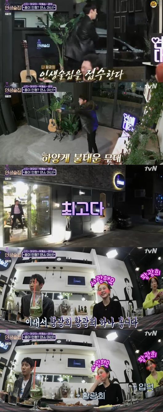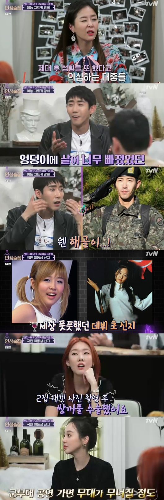 신지의 데뷔 초 사진이 공개됐다. 풋풋했던 사진이었다. 신지는 "2집 자켓 사진 촬영 후 쌍꺼풀 수술했다"며 솔직 고백했다. 귀여운 외모와 상반되는 허스키한 목소리로 사랑받았던 일화도 전했다. 이어 코요태의 불후의 명곡 매들리가 이어졌고, 광희는 수줍음 전혀 없는 참된 예능인 포스로 댄스 삼매경에 빠져 배꼽을 잡게 했다. 완전히 '인생술집' 녹화장을 접수한 광희였다. 야무진 포인트 안무 춤사위로 지칠 줄 모르는 열정을 보였다.