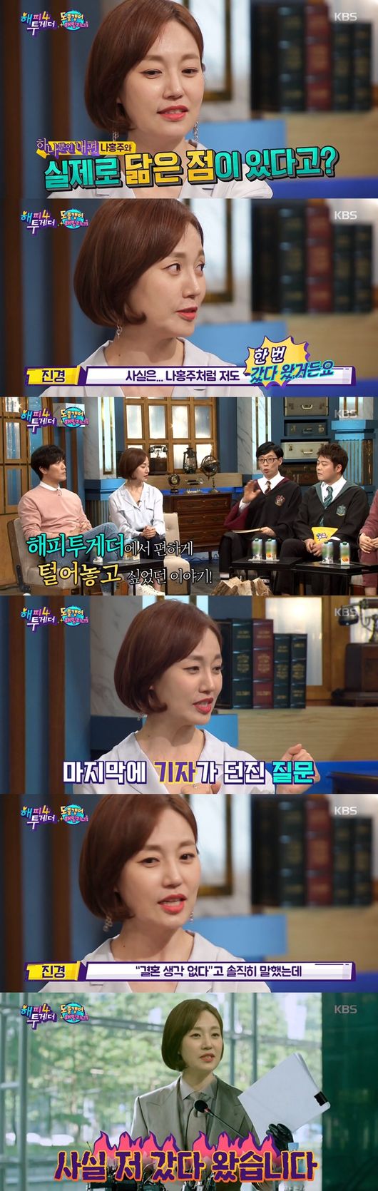 진경은 "인터넷에 보면 미혼으로 뜬다. 제가 KBS2 주말드라마 '넝쿨째 굴러온 당신'을 하고 첫 인터뷰를 했는데 기자분이 '결혼 생각은 없느냐'고 물으셔서 '없다'고 답했더니 '아직 싱글인 그녀는 결혼 생각이 없다고 한다'고 쓰셨다"고 설명해 이해를 도왔다.