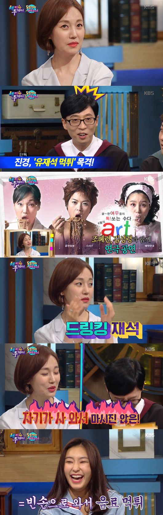 이날 진경은 '해피투게더4'가 자신의 첫 예능임을 밝히며 "엄마가 전화가 와서 '내 이야기 하지 마라'고 하셨다. 이틀 뒤에 언니가 전화가 와서 '너 내 이야기 하지 마'라고 하더라. 가족 이야기 나오면 할 수도 있는데 캥기는 게 많은지"고 말해 웃음을 안겼다.
