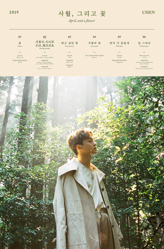 첸의 첫 번째 미니앨범 ‘사월, 그리고 꽃 (April, and a flower)’은 4월 1일 오후 6시 각종 음악 사이트에서 공개되며, 타이틀 곡 ‘사월이 지나면 우리 헤어져요 (Beautiful goodbye)’를 비롯한 다양한 매력의 총 6곡이 수록되어 있어, 첸의 감미로운 보컬과 따뜻한 음악 감성을 만나기에 충분하다.