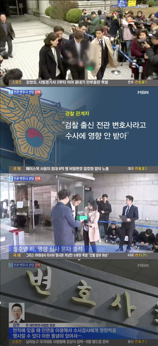 MBN ‘뉴스8’은 22일 오후 정준영의 변호사 선임 소식을 보도했다. 보도에 따르면 정준영이 검찰 출신 거물급 전관 변호사를 선임했다. 경찰은 “검찰의 수사 지휘를 받고 있지만 수사에는 영향 받지 않는다”고 입장을 전했다.
