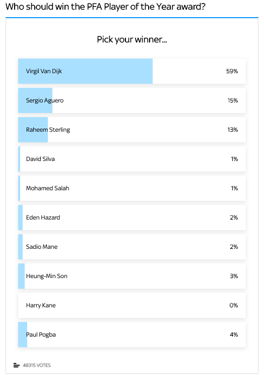 손흥민보다 많은 득표를 한 선수는 4명이었다. 그 중 절반이 넘는 팬들은 버질 반 다이크(리버풀)에게 지지를 보내 올해의 선수 수상이 유력하다고 예상했다. 반 다이크는 전체의 59%를 득표했다.
