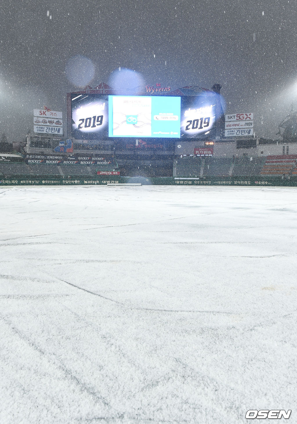 SK 와이번스와 KT 위즈의 맞대결이 예정돼 있는 인천SK행복드림구장에도 많은 눈이 내리고 있다. SK 관계자는 "처음에는 우박같이 내리다가 많은 양의 눈이 내리기 시작했다"고 설명했다.