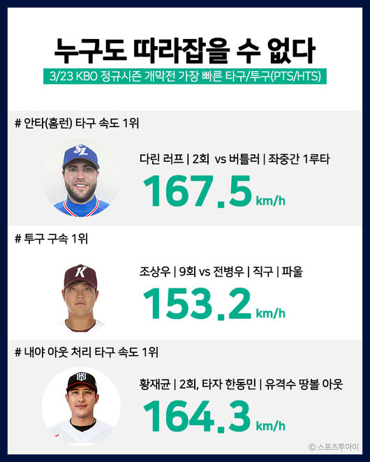한국프로야구위원회(KBO) 공식 기록 업체 '스포츠투아이'는 PTS(Pitch Tracking System)와 HTS(Hit Tracking System) 데이터를 사용해 23일 개막전 '가장 빠른 공'을 분석했다.