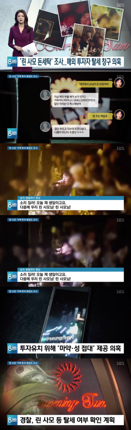 입대는 연기됐으나 아직도 그를 둘러싼 의혹은 해소되지 않고 있다. 특히나 24일 방송된 SBS ‘8뉴스’ 측은 “승리가 대만 손님 등 해외 투자자 유치를 위해 성접대를 준비한 정황을 포착했다. 린사모 등 해외 투자자 유치에 주력했다. 경찰은 이들이 마약 투약 장소를 제공하고 성 접대를 했는지 조사 중이다. 특히 린사모가 돈 세탁 창구로 버닝썬을 이용했는지 그 과정에서 탈세는 없었는지도 추적하고 있다. 그러나 연예인과 경찰 사이에 금품이 오간 결정적인 정황은 아직도 잡히지 않고 있다”고 보도했다.