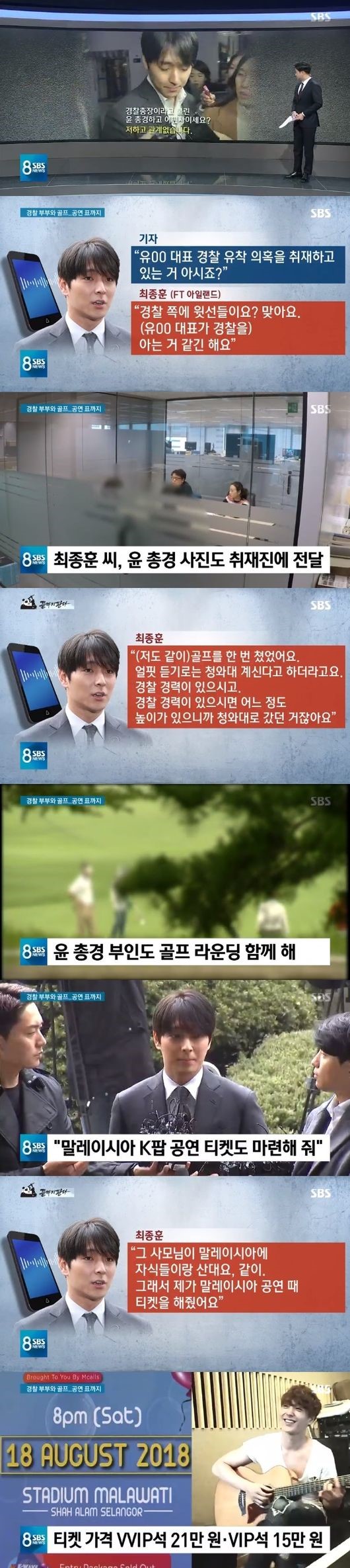 지난 18일 방송된 SBS '8뉴스'에서 최종훈은 “유리홀딩스 유 대표 경찰 유착 의혹을 취재하고 있는 거 아느냐?”는 질문에 “경찰 쪽 윗선들이요? (유 대표가) 아는 거 같긴 하다. 나도 같이 골프를 한 번 쳤다. 얼핏 듣기로는 청와대 계신다고 하더라”고 밝혔다.