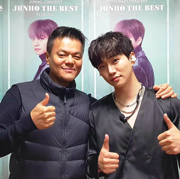 박진영은 25일 개인 SNS에 이준호와 함께 찍은 사진 한 장을 게재했다. 사진 속 두 사람은 이준호의 한국 솔로 콘서트 'JUNHO THE BEST(준호 더 베스트)' 공연장의 포스터 앞에서 다정한 포즈를 취했다. 박진영은 한 손으로 이준호의 어깨를 감싸며 반대 손으로 엄지를 들었고, 이준호 또한 양손으로 엄지를 들어 서로에 대한 응원과 신뢰를 드러냈다.