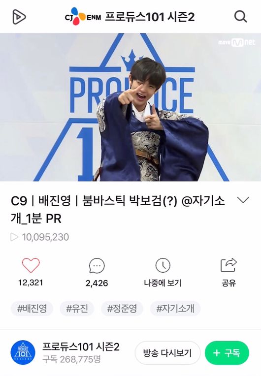 배진영의 ‘프로듀스 101 시즌2’ 자기소개 1분 PR 영상이 1천만 뷰를 돌파했다.