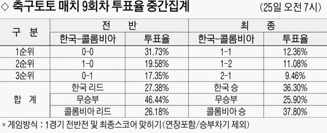 국가대표평가전 한국(홈)-콜롬비아(원정)전 축구토토 매치 9회차 중간집계