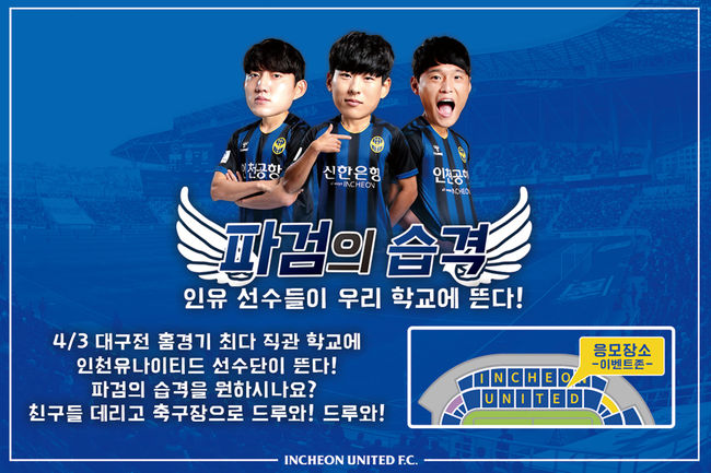 인천 구단 관계자는 “인천을 응원하는 관내 초, 중, 고교 팬들을 위해 ‘파검의 습격’ 이벤트를 진행하고자 한다”면서 “올 시즌 첫 평일 야간경기인 대구전 홈경기에 학생들의 많은 관람을 부탁드린다”고 당부했다.