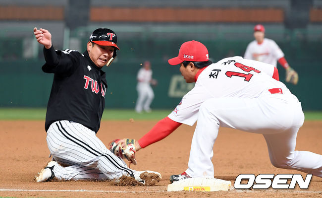 LG는 9회 선두타자 유강남이 SK 마무리 김태훈 상대로 우중간 2루타로 출루했다. 정주현의 유격수 땅볼 때 귀루가 늦은 2루 주자를 잡으려다, 강승호의 송구 실책으로 주자들이 모두 세이프됐다. 이형종이 희생번트를 성공해 1사 2,3루가 됐다. 하지만 이형종이 번트 후 3피트 라인을 벗어나 1루 파울라인 안쪽으로 달리면서 '수비 방해'가 선언, 주자들은 1사 1,2루가 됐다. 오지환의 2루수 병살타로 찬스가 무산됐다.