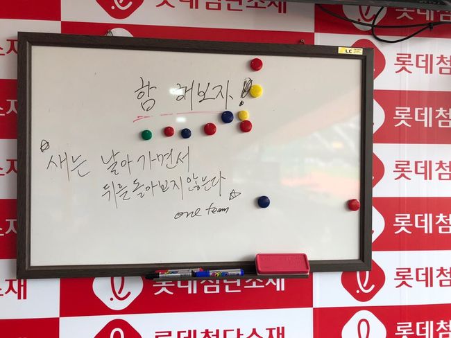 28일 부산 사직구장에서 열리는 삼성 라이온즈와의 경기를 앞둔 사직구장 덕아웃. 양상문 감독의 자리 옆에 붙여져 있는 화이트보드에는 시인 류시화가 지난 2017년 발표한 산문집의 제목 ‘날아가는 새는 뒤돌아보지 않는다’가 적혀져 있었다.