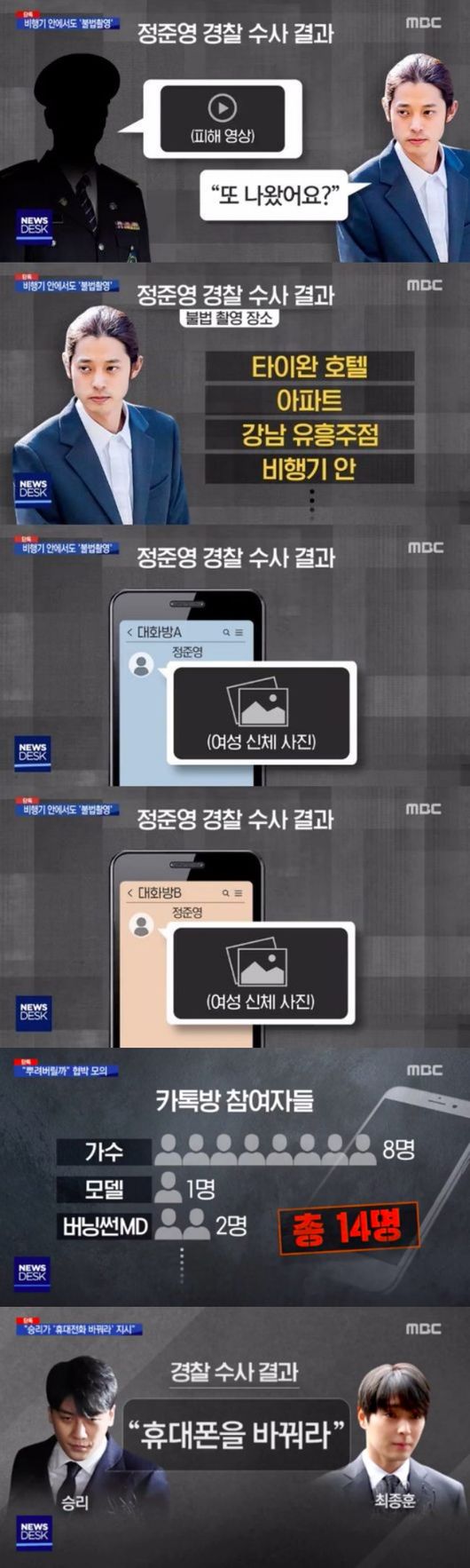 MBC ‘뉴스데스크’는 지난 28일 정준영이 불법으로 촬영한 영상을 공유한 단체 대화방에 승리와 최종훈, 용준형을 포함에 14명의 멤버가 참여했다고 보도했다. 가수 K씨와 J씨를 포함해 모델 L씨, 유리홀딩스 유 모대표 등이 속해 있었다고 설명해 추측이 이어지고 있는 상황.