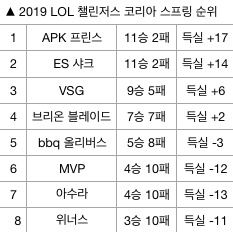 VSG는 29일 오후 서울 대치동 프릭업스튜디오에서 열린 '2019 LOL 챌린저스 코리아(이하 롤 챌린저스)' 스프링 스플릿 bbq와 2라운드 경기서 2-1로 승리했다. VSG는 시즌 9승 5패 득실 +6을 올리면서 5연승으로 깔끔하게 스프링 스플릿을 마무리했다. bbq는 시즌 5승 8패 득실 -3을 올리며 5위를 유지했다.