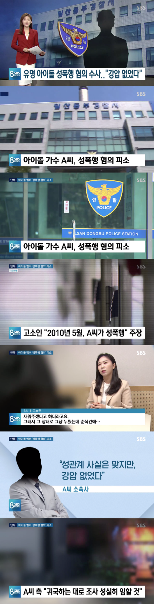 ‘8 뉴스’는 “지난 25일 유명 아이돌 가수 A씨에 성폭행 당했다는 고소장이 접수됐다. 고소인은 일하던 바에서 A씨와 만나 알고 지내던 B씨”라며, “B씨는 지나 2010년 5월 자신의 집에서 A씨에게 성폭행을 당했다고 주장하고 있다. B씨에 따르면 술을 마시고 집으로 찾아와 몸을 만지며 강제로 성관계를 시도했다고 했다. 두 차례 거부의사를 밝혔지만 소용 없었다는 입장”이라고 보도했다.