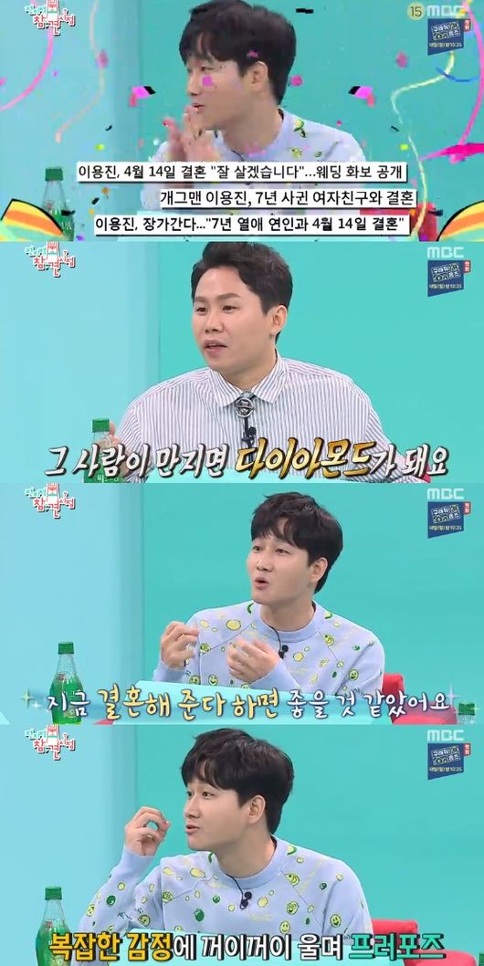 이날 MC들은 이용진의 결혼에 대해 운을 뗐고, 그의 '절친'인 양세형에게 예비신부에 대해 물었다. 이에 양세형은 "지금 여기 스튜디오에 있는 아무 것들 다 포함해서 그 사람이 만지면 다 다이아몬드가 된다"면서 "굉장히 현명하고 올바른 친구다. 이용진의 모난 부분을 깎아줄 수 있는 친구다"라고 답했다.