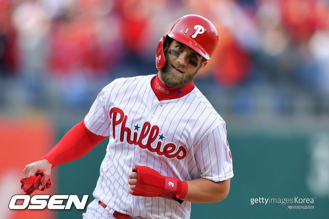 ‘슈퍼스타’ 브라이스 하퍼가 필라델피아 필리스에서 첫 안타를 홈런으로 장식했다. 비거리 140m 대형 홈런으로 기대에 부응했다.