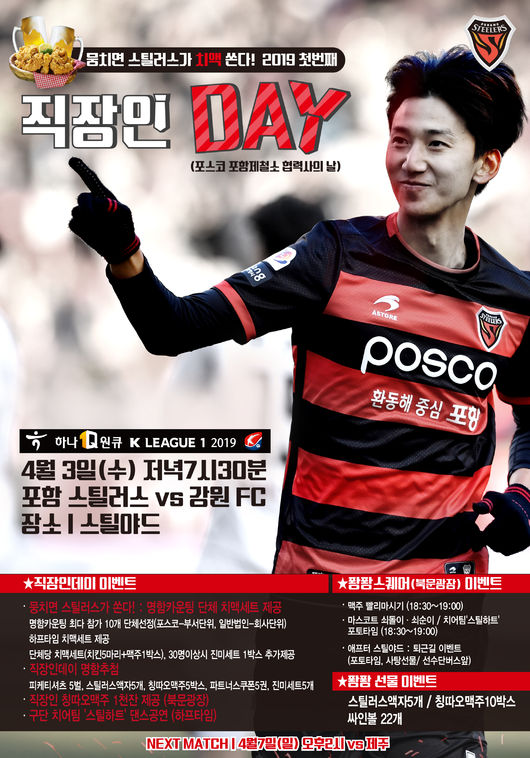 포항은 2019 시즌 첫 번째 주중 홈경기를 포스코 포항제철소 협력사의 날로 정하고 ‘스틸야드 직장인데이’를 맞아 팬들을 위한 다양한 이벤트와 선물을 준비했다.