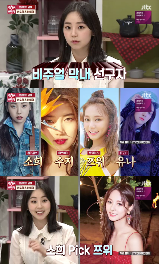배우 안소희가 그룹 트와이스 쯔위를 눈길 가는 JYP 황금 막내로 꼽았다.