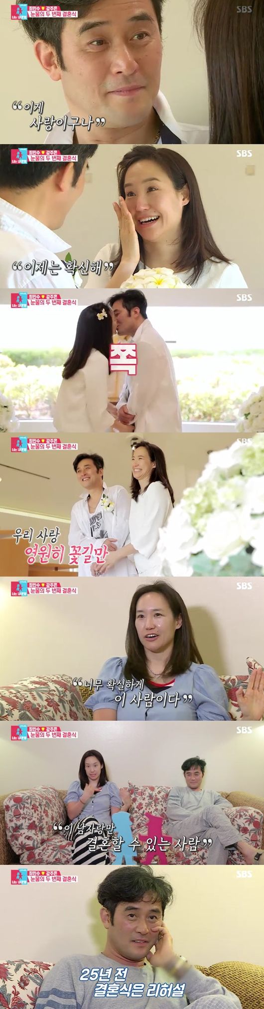 두번째 결혼식에서 눈물로 전한 사랑의 맹세, 최민수는 "또 다른 민수로 살 수있게 해줘서 고맙다"면서 "앞으로도 같이 손을 잡고 따라갈 것, 유일하게 믿을 수 있는 사람, 당신만 있다면 항상 감사하다고, 진심을 전했고, 주은도 함께 눈물 흘리며 "25년 전 결혼이 뭔지 몰랐다"면서 함께 울고 웃은 25년을 떠올리며 "우리 민수 덕분에 새로운 주니가 됐고, 진심으로 사랑을 확실하게 알 수 있게 옆에서 지켜준, 내곁에 있어준 사람, 너무 감사하다, 이게 사랑이구나 알았다"면서 "이젠 확신하다, 감사하다"며 눈물로 사랑의 확신과 서약을 전했다.