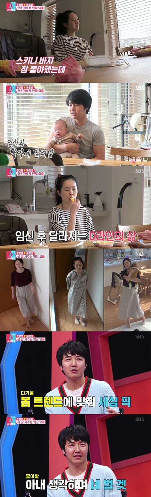 이어 아내의 힘듦을 알기에 직접 아내 옷을 사다줬다고 했다. 그러면서 임신과 육아에 밀려난 '여자'의 평범한 행복인 쇼핑을 언급하며 윤상현은 "옷이 날개라고 한 번 입고 나와봐라"며 서프라이즈 선물을 준비했다고 했다. 윤상현은 옷 방에 선물을 넣어놨고, 봄 트렌드에 맞춰서 사준 옷 선물을 보며 메이비는 감동했다.