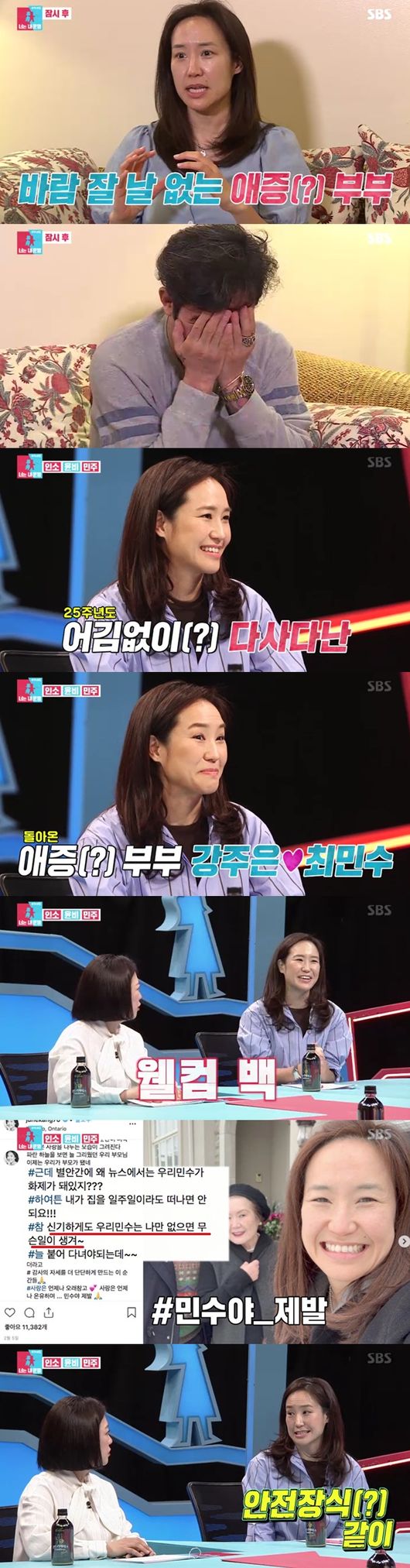 이날 MC들은 "한달 전 25주년 은혼식을 무사히 잘 넘겼다고 한지 얼마 안 됐는데 그 사이 많은 일이 있었다"며 간접적으로 최민수의 사건을 전했다. 강주은은 "나의 부재와 함께"라면서 "신기하게도 우리 민수는 눈 돌리면 큰일이 따라 붙는다"면서 "옆에서 잘 보필할 것, 이를 위해 안전 장치를 설치했다"고 전해 웃음을 안겼다. 민수 잡는 강언니로 다시 컴백을 예고, 강주은은 "또 다시 뒤통수 맞았다"고 인터뷰하는 모습이 그려져 웃음을 안겼다.