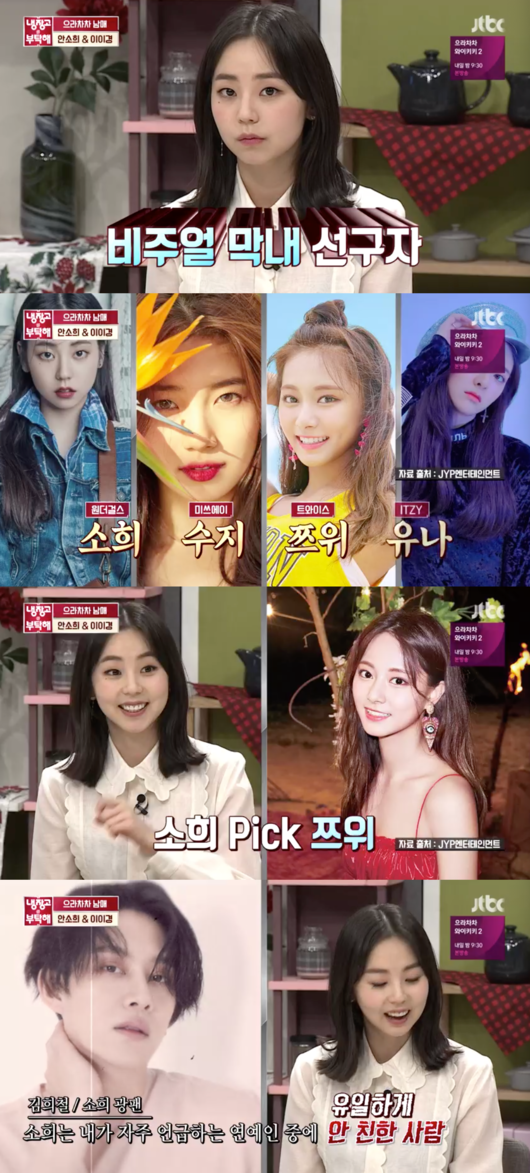 안소희는 지난 2007년 원더걸스로 데뷔, '어머나' 한 방에 팬들을 휩쓰는 '팬덤 제왕'으로 떠올랐던 바다. 이에 MC 김성주는 'JYP 비주얼 막내'의 시초가 안소희라고 밝혔다. 원더걸스 출신의 소희, 미쓰에이 출신의 수지, 트와이스의 쯔위, 있지의 유나가 바로 그 주인공. 안소희는 '요즘 눈길 가는 막내는 누구냐?'는 질문에 "트와이스의 쯔위다. 너무 예쁘다"며 후배에 대한 애정을 드러냈다.