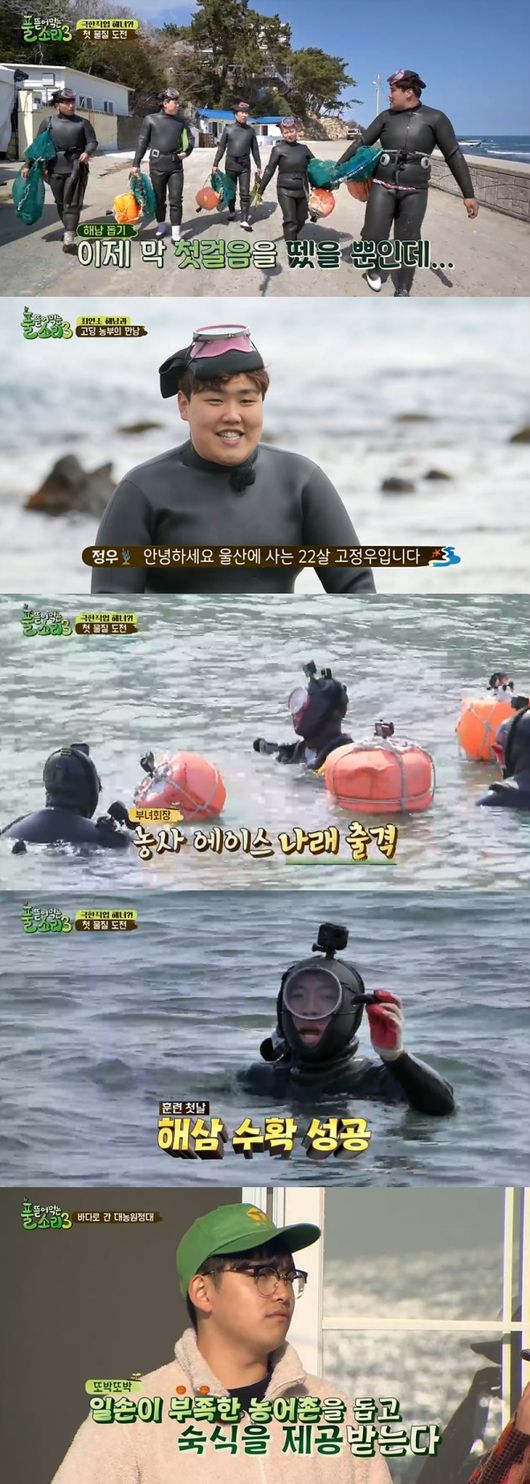 이야기를 나누던 이들 앞에 고무신과 꽃양말, 해녀복까지 입은 강렬한 인상의 한 청년이 등장했다. "서울에서 오신다고 욕 봤심더"라는 구수한 사투리와 함께 나타난 그는 앞으로 며칠간 멤버들에게 물질을 가르쳐 줄 국내 최연소 해남 고정우였다. 한태웅은 "단번에 보자마자 옆집 할머니 같은 느낌이 들었다"고 밝혔고, 고정우가 들고 온 전복, 뿔소라, 해삼,문어의 자태는 멤버들의 넋을 나가게 만들었다. 멤버들은 수산물을 손질하는 방법을 전수받고 든든하게 속을 채운 뒤 해녀복 착용에 돌입했다.