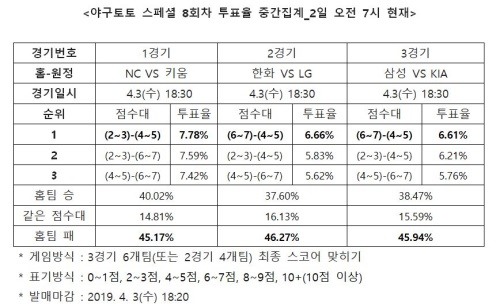 KBO 3경기 대상 야구토토 스페셜 8회차 투표율 중간집계