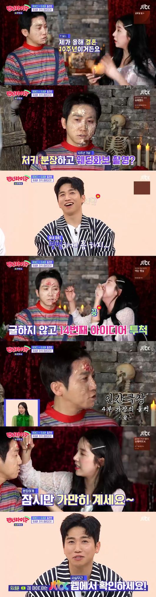 퓨어디는 "잠깐 입좀 분장하겠다, 잠시만 가만히 있어달라"고 부탁해 웃음을 안겼다. 유세윤은 "올해 결혼 10주면"이라면서 처키 분장하고 웨딩화보 촬영을 하고 싶다며, 오늘 영상 아이디어를 냈다. 그러면서 "새로운 분장하다보니 생각의 날개가 자유로워졌다"고 말했다.