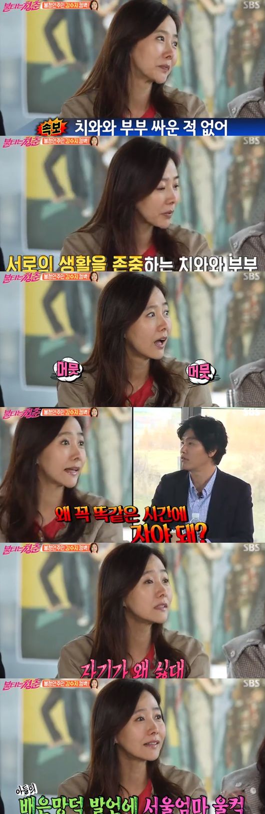 수지는 청춘들과 콘서트 관련 기사를 확인하면서 ‘치와와 커플’로 이름을 날렸던 지난 날과 달리 ‘김국진 강수지 부부’로 보도된 것을 보고 낯설어 했다.