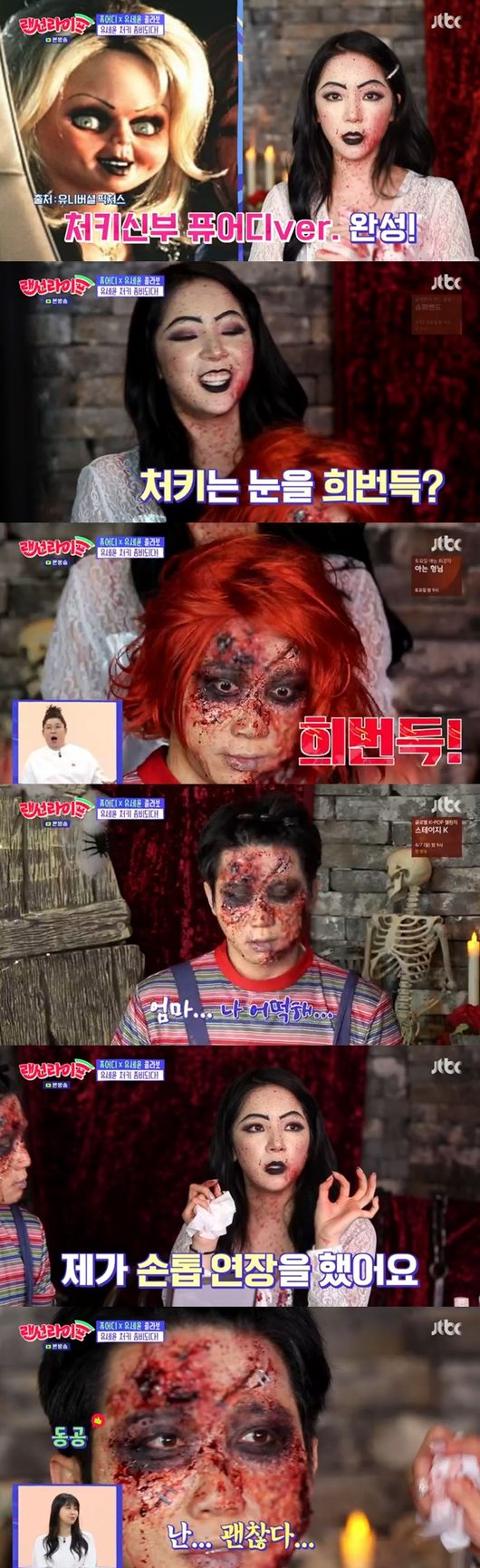 처녀귀신처럼 하얀 소복으로 갈아입은 퓨어디와, 처키처럼 의상을 갈아입은 유세윤이 본격적으로 분장을 시작했다. 처키 분장을 퓨어디화 해보겠다고 했다. 처키의 상처난 피부표현부터 구하기 쉬운 재료를 이용해 특수분장하는 꿀팁을 전했다.